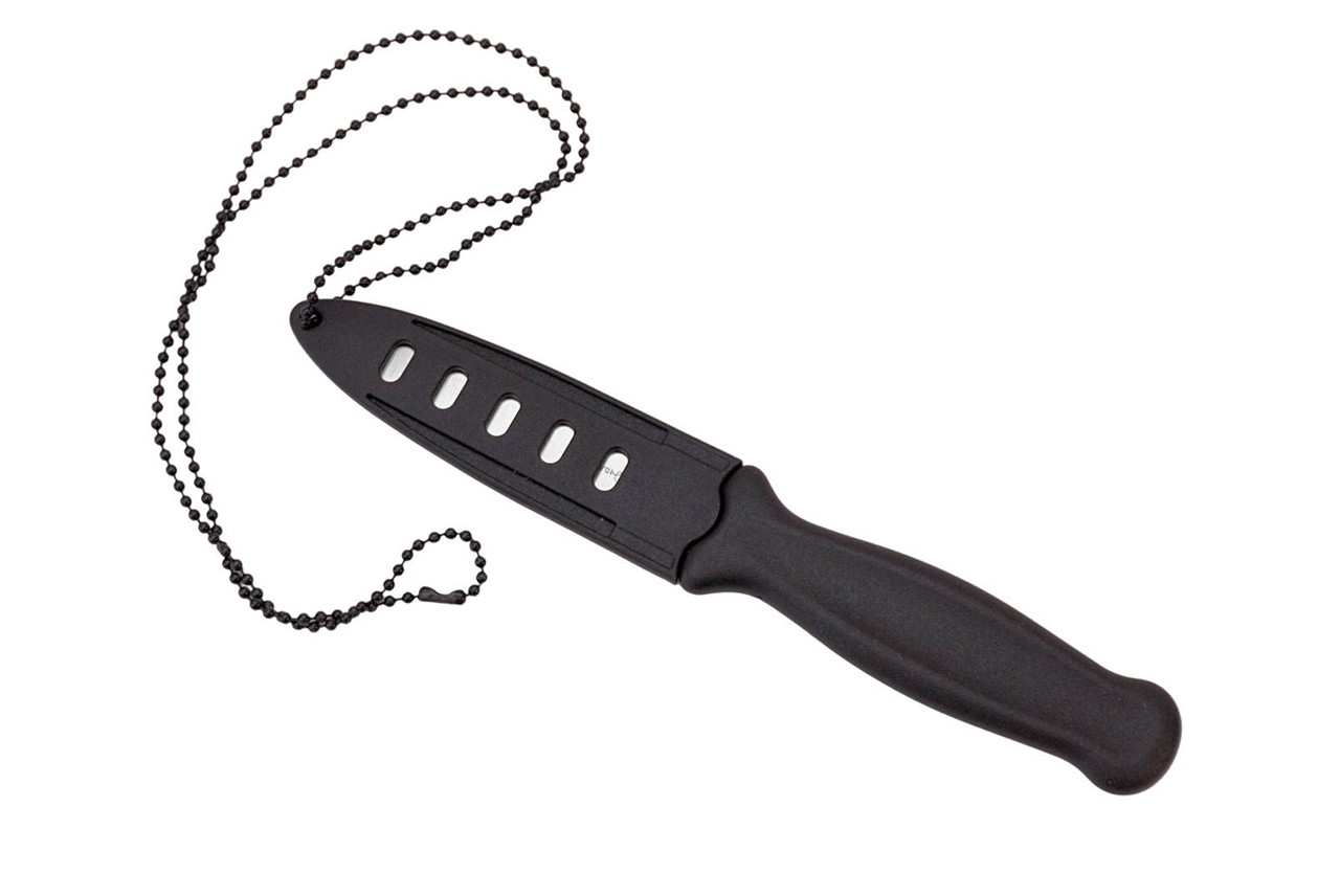 The ergonomically shaped plastic handle fits securely and comfortably in the hand. Each knife comes with a practical sheath and carrying chain – ideal for wearing around the neck.