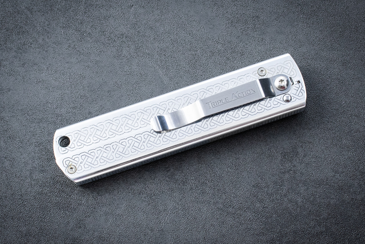 A super-tough blade of VG-1 stainless steel provides superb cutting ability in the world's finest combination of blade strength and flexibility. The aircraft grade aluminum handle (roll engraved with a distinctive pattern) gives the Triple Action® an exceptional look, and the pocket clip makes it easy to carry. Cold Steel's® Triple Action® Folder is among the safest knives you can carry. When closed, the blade is totally encapsulated by the locking cover, and when open the solid aluminum construction and heavy duty lock prevent the blade from closing. So, the Triple Action® Folder is as strong as (or possibly even stronger than) a butterfly knife while also being legal to carry in most states where the butterfly is banned.