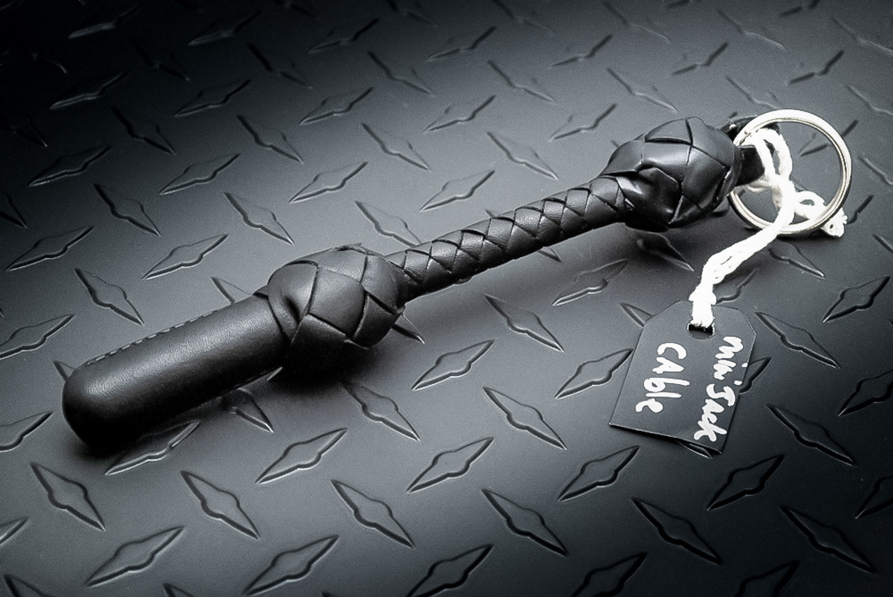 Since 2003 D3, Protection has been a maker of hand made high quality leather goods including saps & blackjacks, and impact weapons. Ranging from key chain saps and coffin flat saps to aluminum batons. Every item is made by David Doerr, in western Canada. Using only the finest leather and hardware available. These leather pieces are made of excellent quality materials and craftsmanship. "D3 Protections flat saps, Finger saps and blackjacks are all made of the highest quality American made leather tanned by Herman Oak and are built for many years of loyal service. Flat saps consist of a flat spring with a lead ingot casted to it, this is known as the "frame". The frame is then covered with multiple layers of thick leather and sewn through all the layers. D3 Protections blackjacks are all made around custom made frames casted by me. The frame is then wraped with various types and thicknesses of leather." These are some fantastic paper weights! Shown here is a 7" D3 Protection Braided mini jack constructed on a D3 Protection tapered frame the lead is cast to one end only and braided with a 6 plait braid in Kangaroo hide. The strap is a key ring and made from 4 oz black leather, Total weight of 5.5 oz. Available options: cable and springAvailable colors: Black, Green, Blue, Brown and Red. This item is solely for display, collectible, historical, commemorative, or prop purposes.
