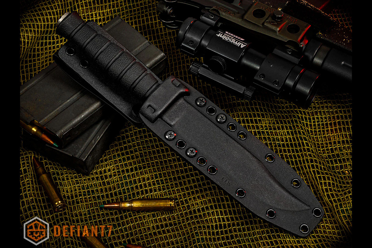 The M320 is 11" overall with a 6.75" blade made from ultra tough, 3/16" thick CPM-3V Carbon Steel (HRC 59-60). The knife has two distinct titanium parts, the guard is machined from a solid 1/2" thick billet of Grade 5 titanium, and the aggressively textured, butt cap is also made from the same material. The full-tang handle features a super durable and grippy injection-molded Polymer handle that offers a sure grip in all conditions. We include a ambidextrous kydex sheath that works great for belt carry and it can be attached to PALS webbing on a wide range of gear.