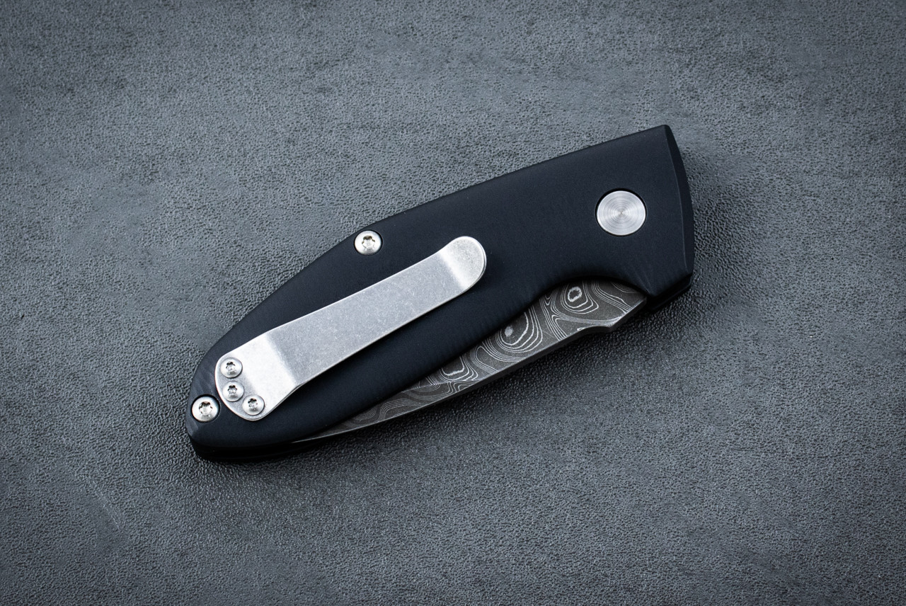 Alpha autos are constructed with 3D contoured, 6061 aluminum handles in a rich, black hard-coat anodized finish with a light machined texture for a sure grip. Each knife features a titanium pocket clip for tip up carry. The 3.5" blade is available with stunning Nichols Stainless Damascus Black Boomerang blade. Weighing in at only 4 ounces, this is one knife you won't leave at home!