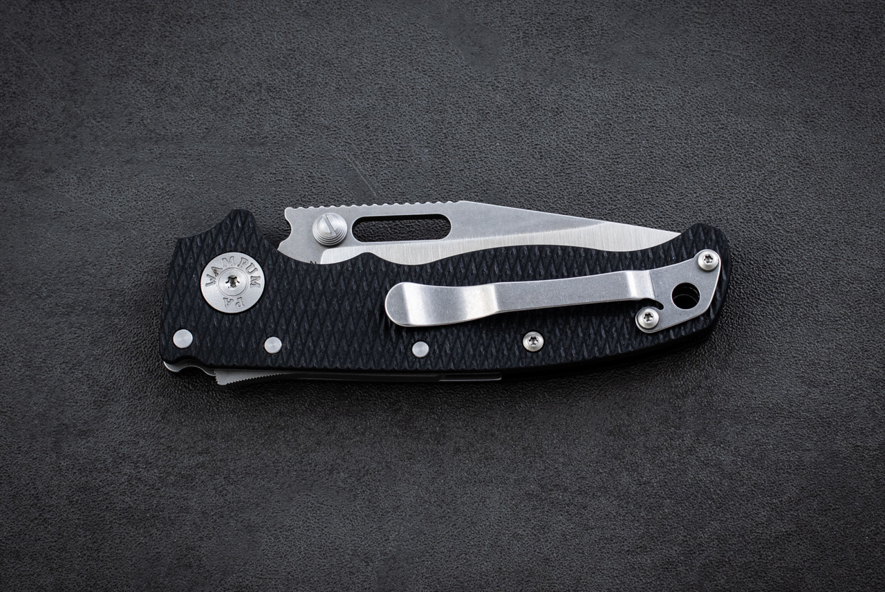 The Shark Lock mechanism is situated on the spine of the knife and operated with a ramp-like ‘fin.’ Opening the blade makes the spring-driven lock arm move up and then into a notch in the tang, situating it beneath a lock pin. This range of movement is noteworthy. It’s unique in that the locking mechanism moves forward and back while also moving up and down. This allows for a greater sized blade tang, making better mechanical advantage in a specific area. And because the drive spring that moves the locking element up into the locked position is contained within the locking arm itself, it won’t be subject to dirt and grime. The Shark is very comparable to most Tri-Ad locks for its size and weight. The AD-20.5 has been tested to 875 inch pounds of torque, this is a very impressive number for a 3.5 oz. knife.This one has been super-charged by the Krein regrind. For years now, Tom Krein has been building a name in the knife community with his well-regarded regrinds. These grinds give you thinner blade geometry for ultimate slicing ability - far better than from the factory. The OEM warranty is void on this product due to the regrind.