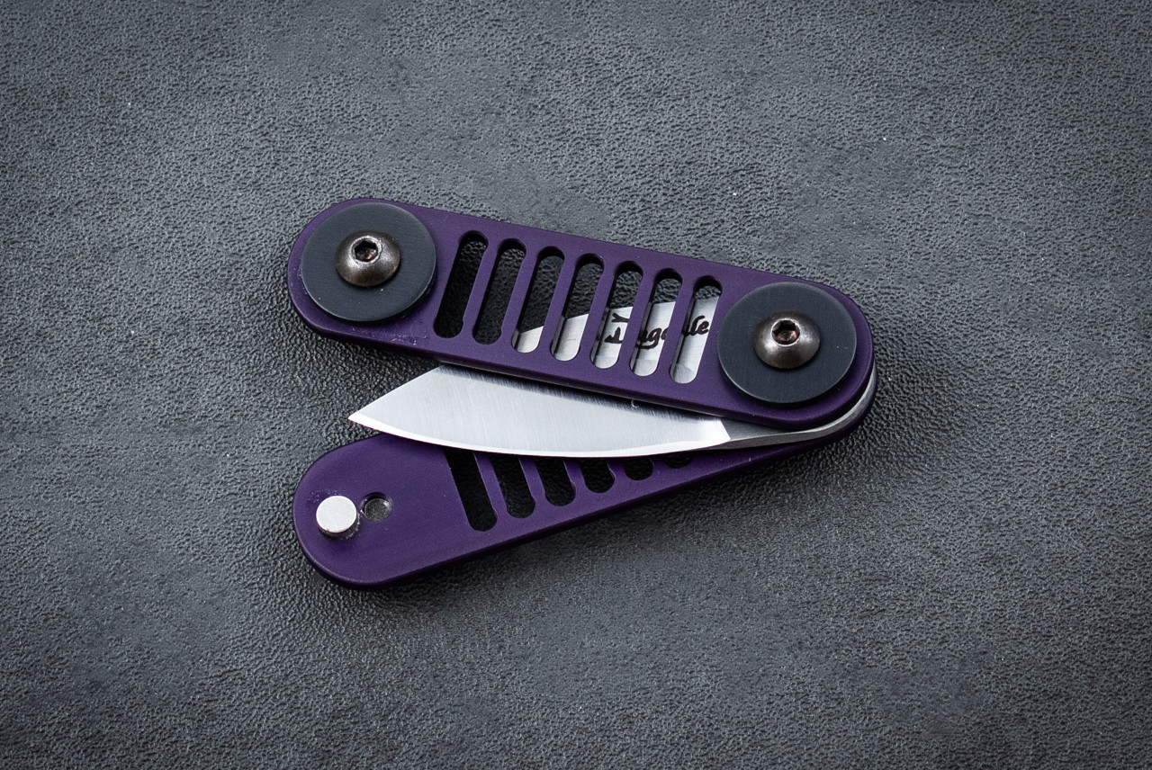 This magnetic folding knife by Dan Dugdale showcases a satin-finished blade paired with an anodized aluminum frame. It is accented with black pivot collars and features integrated magnets at the butt, enabling the knife to remain securely in either the open or closed position.