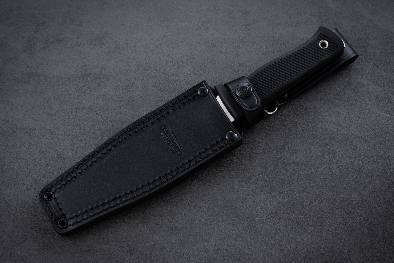 The Fallkniven A1 is an all-purpose knife on the larger side designed for heavy duty use. The powerful blade is made of extremely hard and tough laminated VG10w steel, and will withstand the stress of hard use. The knife is superb at chopping as well finer daily cutting tasks thanks to the ergonomic grip. The full tang goes entirely through the handle so you can strike with the end of it without breaking the grip. The sturdy black leather sheath allows you to fasten the knife on your belt or your pack, and even upside down. The Fallkniven A1 is unaffected by water and works equally well in extreme cold and stifling heat.