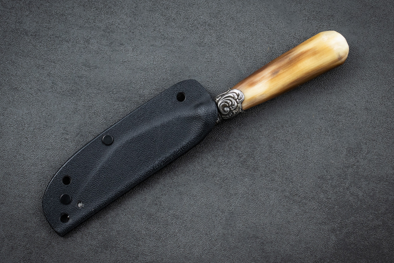 This seax is made from old French table knives dating from the early 20th century, around 1900 up to World War II. Fred Perrin carefully chose the original blades and brought them back to life. He re-ground each blade, heat-treated it, and added a completely new handle. The result is a unique, fully functional knife that combines the history of the old steel with Fred’s modern craftsmanship, keeping the character of the original while turning it into a tool you can actually use. Specifications: