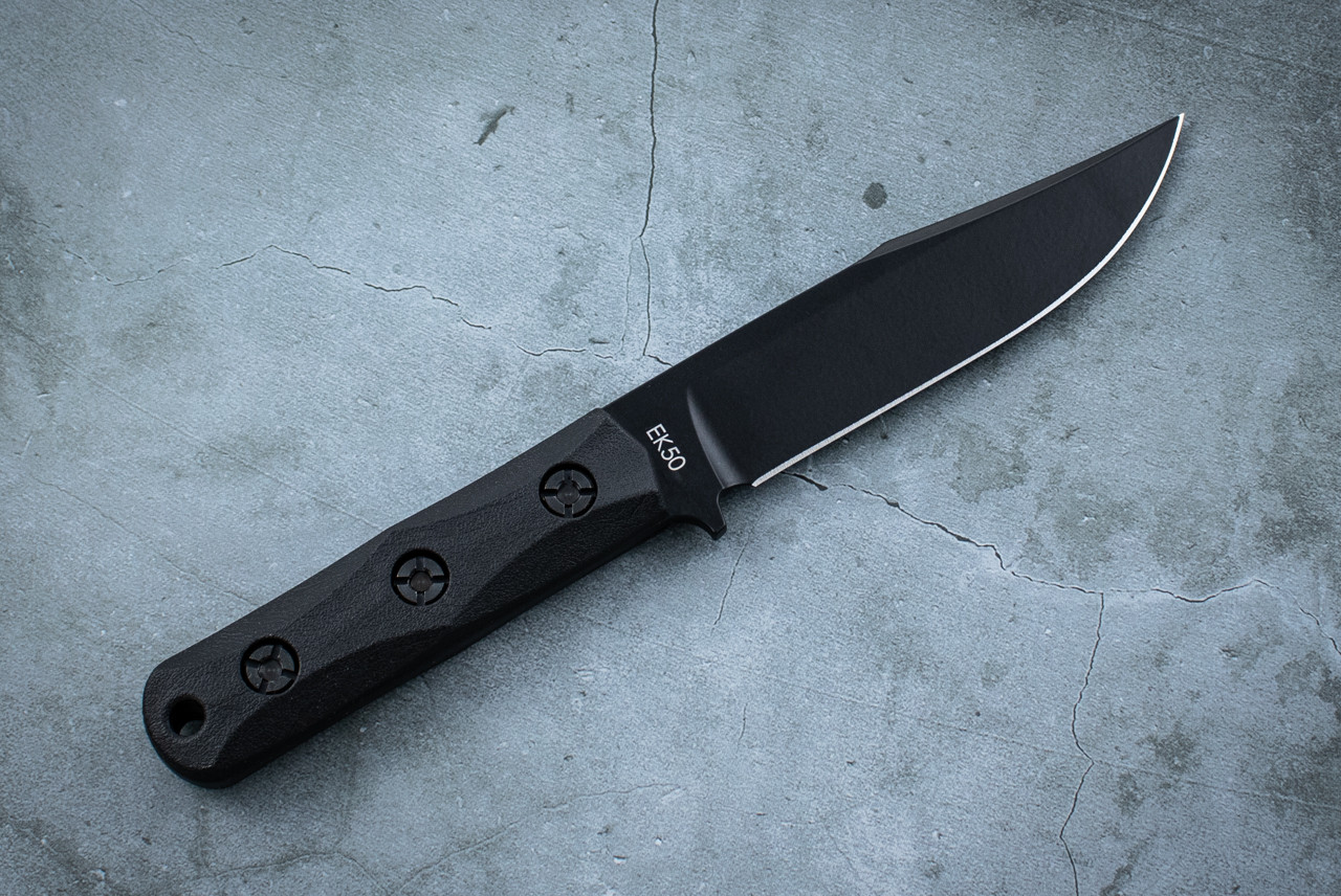 The EK50 Short Clip Point has a 1095 Cro-Van clip point blade that measures 5.0625” in length. The EK50 is 9.25” overall and weighs 0.65 lb. A MOLLE compatible Celcon® sheath that is manufactured in the USA comes with the EK50. Knife manufactured in the USA with German steel.