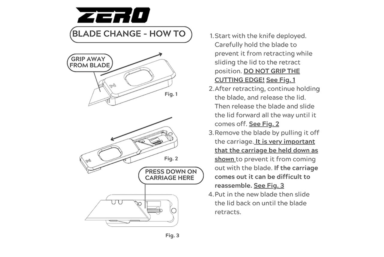 This version of the Zero knife includes a lanyard hole machined into the body. The knife does not come with a lanyard. Utility Blades do have some variation in their specs, and most have been found to work with our carriage system. Known 2 Notch Blade compatibility: Workpro SK5's (61mm), Dewalt Carbide Edge, Rapid Edge Serrated Blades, Milwaukee, Titan, Berkling SK2h black, Jet sk5 Titanium coated, and some generic unbranded SK5's. Blade incompatibility: Fiskars. Ceramic blades are not recommended. Specifications: