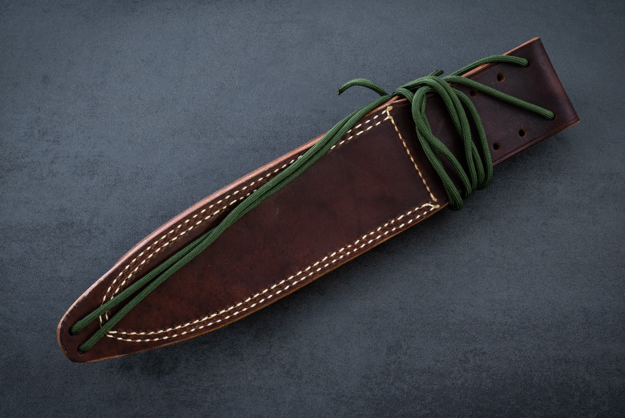 7 1/2" Blade of 1/4" stock. Sawtooth edge on top (sawteeth not offset). Approximately 4 3/4" stainless steel tubular handle, 1" diameter, silver soldered to 1/4" oblong brass hilt. Fitted with removable and threaded brass butt cap and waterproof O-ring. Flared holes in top and bottom of hilt accommodate wrist thong. Knurled handle.