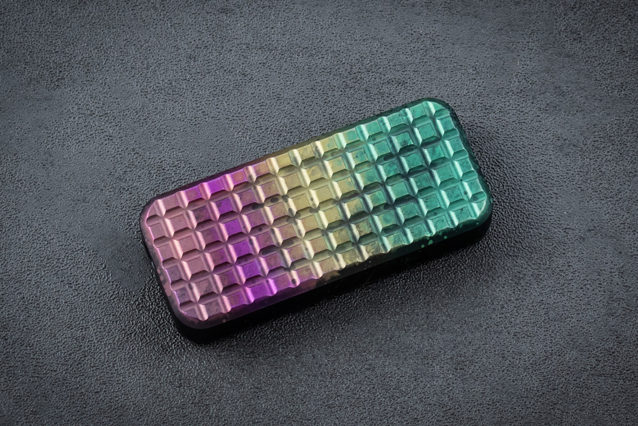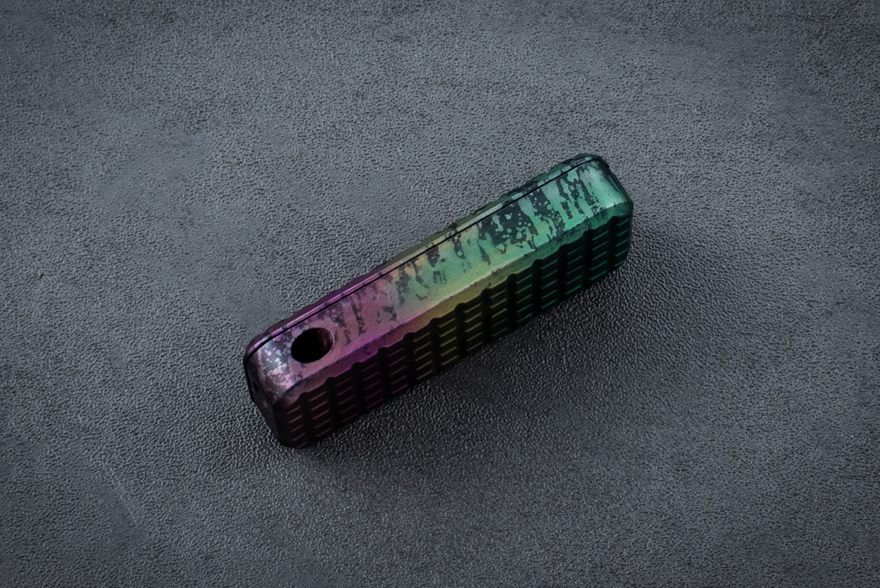 This is a knife we sent off to Cadlab CNC for a custom anodize job. Of course, they absolutely killed it! These guys are machinists and artists with immense skill.