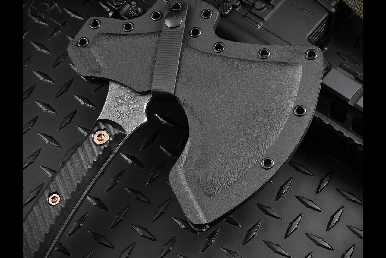 Like so many of the products RMJ designs, The Berserker Blackout was inspired by tradition. In this case, a 9th century Viking wood ax was the inspiration. In addition to the aggressive and distinctive looks, The Berserker is a formidable and functional tool. It features a robust head with nearly 5" of cutting edge, and a curved ergonomic handle that makes this ax a well balanced tool with incredible cutting capability. In addition to the large main edge, the upper and lower forward edges have been sharpened to add more cutting options. The bearded design allows for a high grip for accurate fine motor skill work. The 3D contoured G10 handles incorporate a diagonal, grooved texture for a sure grip without being overly aggressive in feel. The Berserker Blackout features a unique acid etched finish. Each one will have its own character, no two are the same. Included is a bottom-eject molded kydex sheath and low-ride M.O.C. straps.