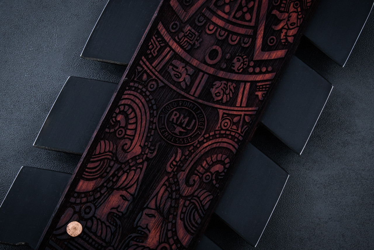 Crafted with precision and attention to detail, this modern interpretation of the traditional Aztec macuahuitl features a laser-engraved hickory handle and dual steel blades securely peened to the wood using copper rivets. Designed by Ryan Johnson, this striking piece is as visually impressive as it is historically inspired—an exceptional fusion of craftsmanship and cultural homage.