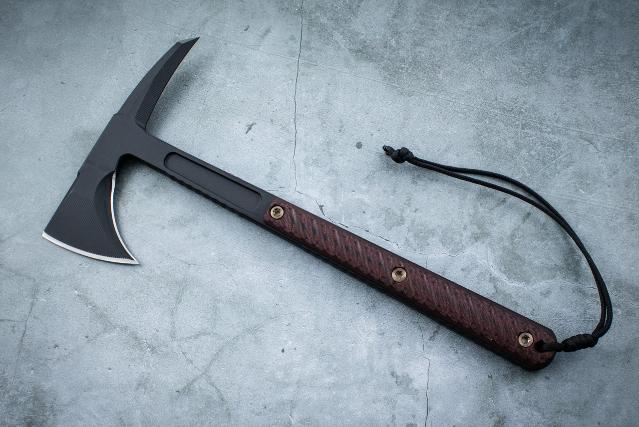 This is our Exclusive Kestrel Tomahawk with black/cherry handle scales and a Black Cerakote Finish. The 13" Kestrel Tomahawk is a highly capable tool and is a more compact version of the venerable 18" RMJ Eagle Talon. This multi-use tomahawk was designed to cut through difficult obstacles as well as for use as a breaching and extraction tool on buildings and/or vehicles. It is a tool intended to help you win the day, whatever challenges you may face. RMJ considers weight to be an asset of the Kestrel and at 1 pound 9 ounces it packs a punch. The 13” length means it can also be wielded effectively in tight spaces.