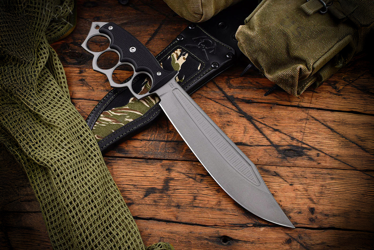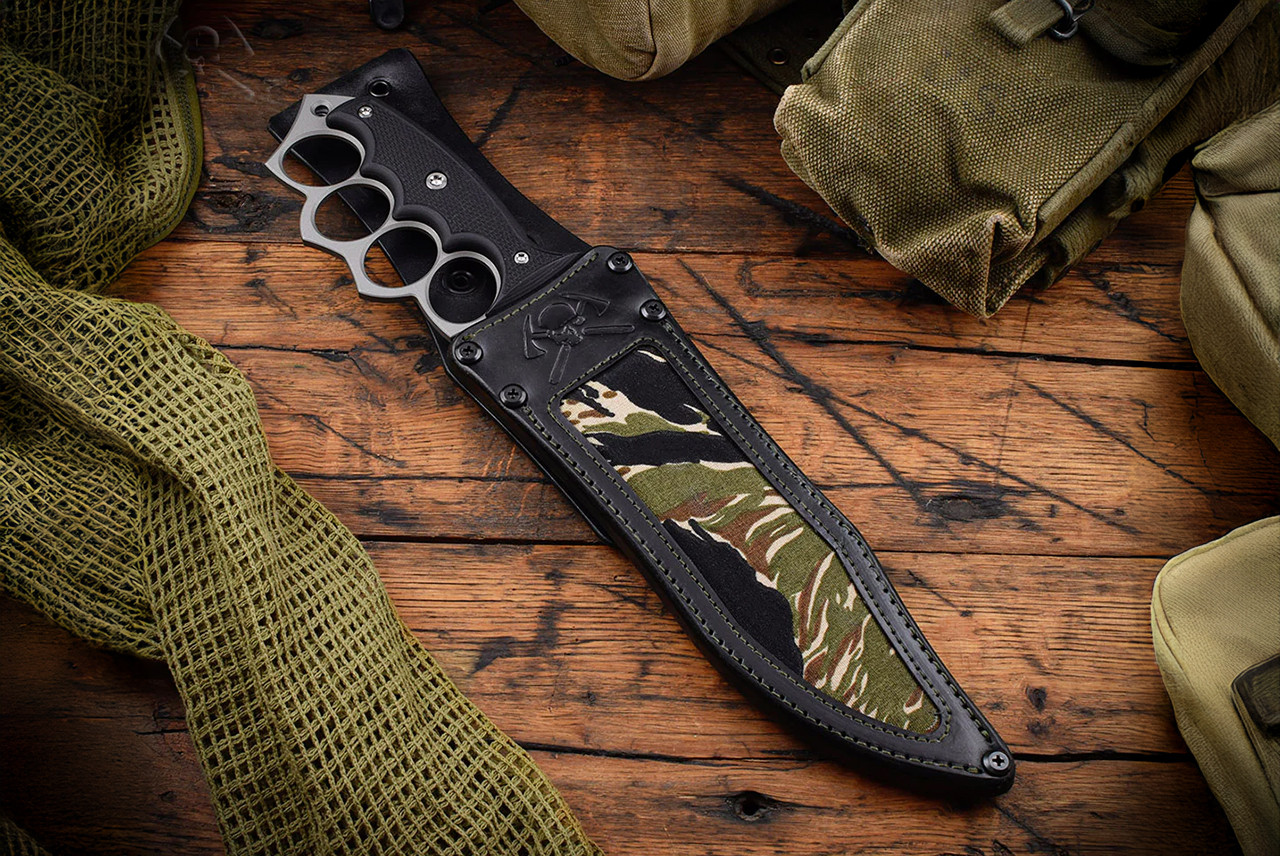 Embodying history and our own design philosophies, the Marauder is our twist on a larger than life, Trench Bowie. We decided to go big with a 15.25" overall length, and 9 5/8" CPM-3V bowie style blade with an aggressive fuller. The knuckle duster style handle acts as a guard to protect your hands, and the aggressive outward shape works well for raking. To round out the overall shape, the end of the handle features a pronounced pommel for hammer-striking. The handle is finished with Black G10 handle slabs that are attached with Grade 5 Titanium fasteners. Marauders include a leather sheath with camo inlays on both sides. The sheath is ambidextrous, and can be worn on a belt or attached to PALS webbing. There are three versions available: