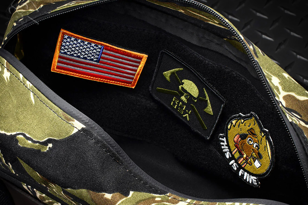 Built from ultra-tough Vietnam Tiger Stripe 500 Denier Cordura nylon, this bag will hold up to anything you throw at, or in it. The outside of the bag features two quick-access zippered pockets on each side for small gear like knives, magazines, multitools. Both sides also have large loop panels to attach your favorite patches.