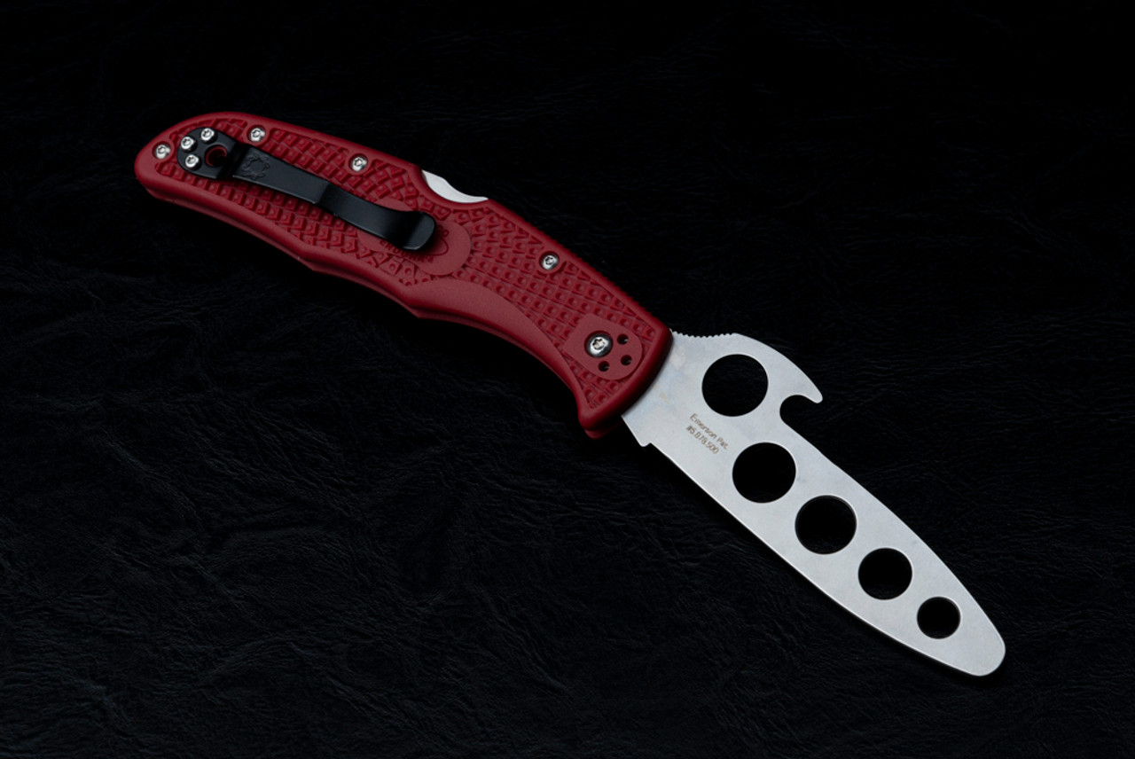 Gaining proficiency in safely handling and opening an Emerson folder comes through repetitive practice. Delica and Endura Emerson Opener Trainers are identically sized, proportioned and weighted replicas of their "live" counterparts sans a sharpened edge and point. Designating them trainers are their red FRN handles. The handles have Bi-Directional Texturing™ for traction and screw-together construction for cleaning and adjustment. To reduce weight the dual handle liners are skeletonized stainless steel and holes in the blade remove even more ounces. Phosphor bronze washers smooth open/close action and the clip attaches in four-positions: tip-up/ tip-down, left- or right-hand.