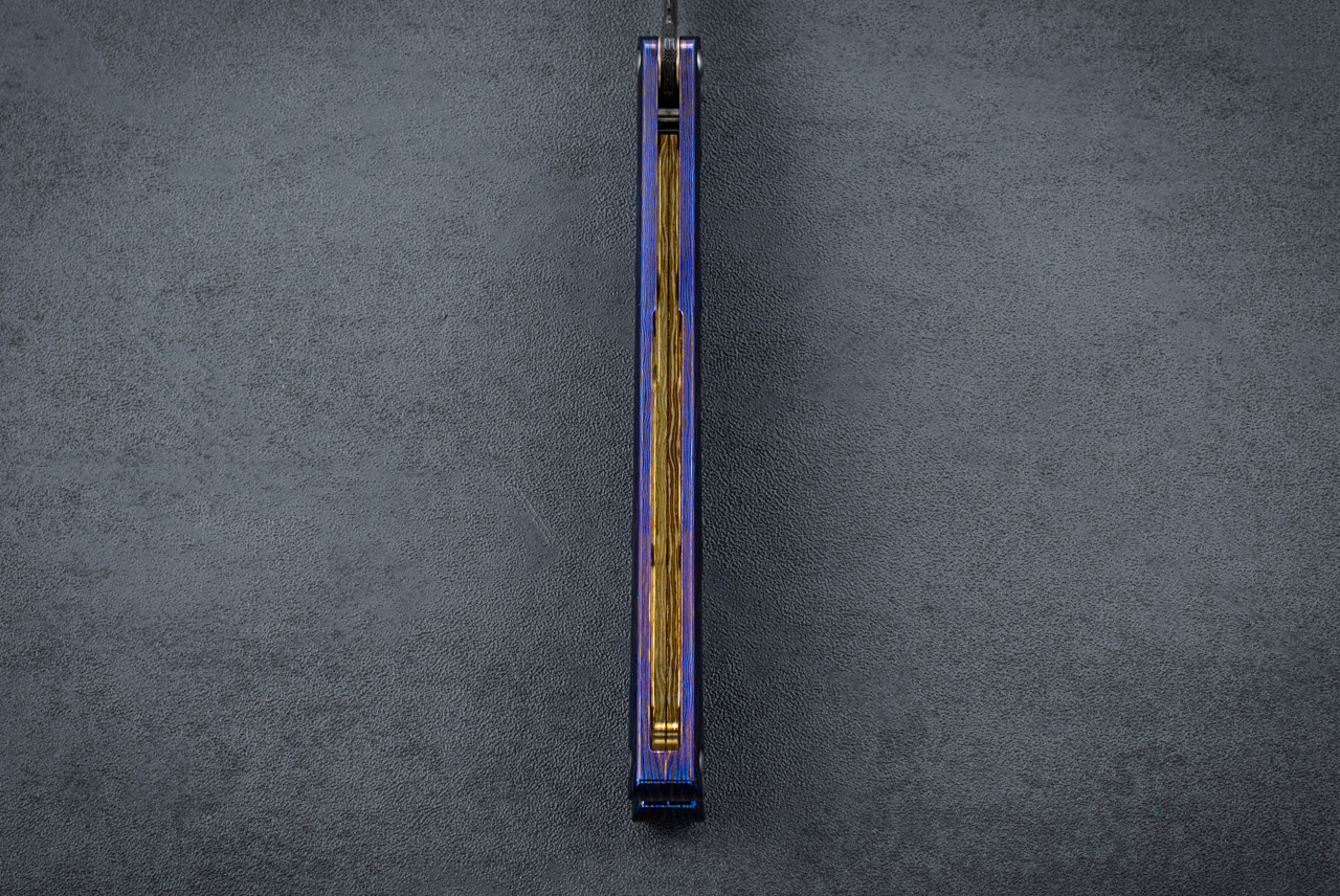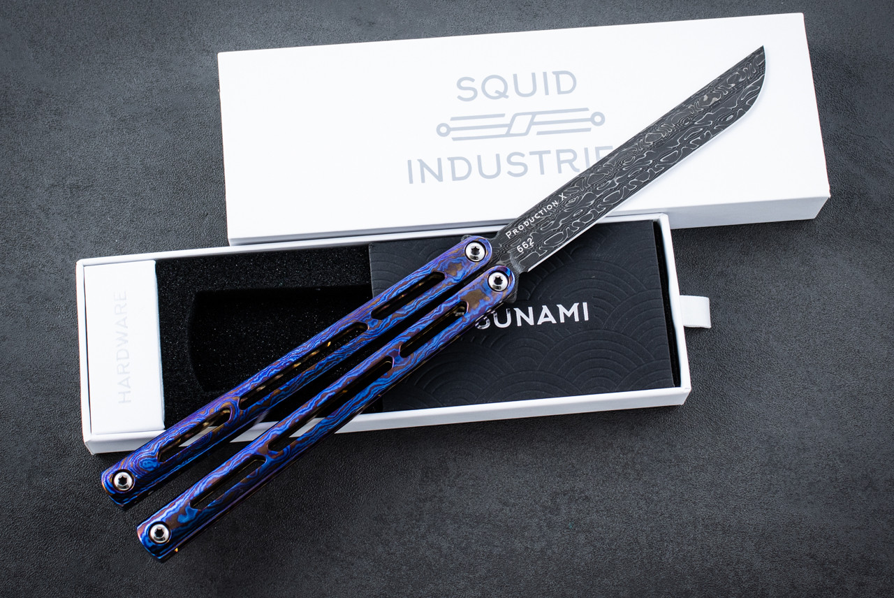 The Tsunami represents the pinnacle of flipping innovation from Squid Industries. The Tsunami Half-Dressed is a refined variation of the renowned Full-Dressed Damascus Tsunami, combining a high-performance blade with signature Damascus-patterned handles. Finished in an anodized royal blue over intricate Damascus, each piece stands out as both a precision tool and a work of art. The premium materials, complex machining, and limited production behind every Tsunami directly contribute to its elevated price—making it not just a balisong, but a collector-level piece built for both performance and exclusivity.